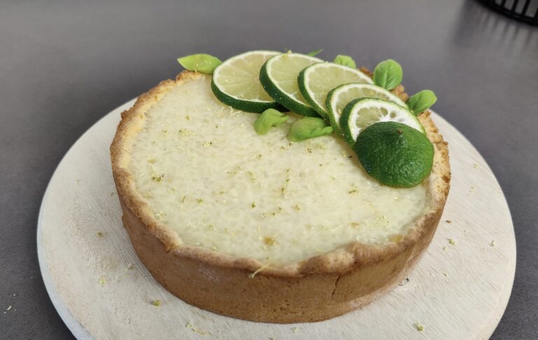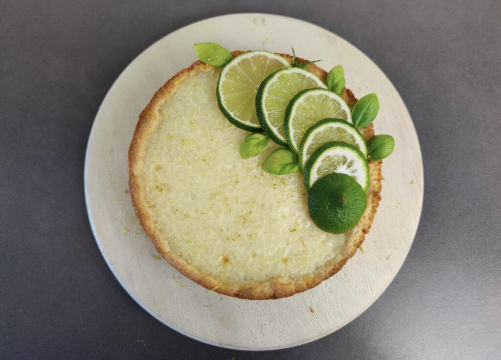 Für die Deko schneide ich eine Limette in Scheiben und Zupfe die Kräuter. Das alles lege ich wenn der Kuchen fertig ist nach belieben auf den