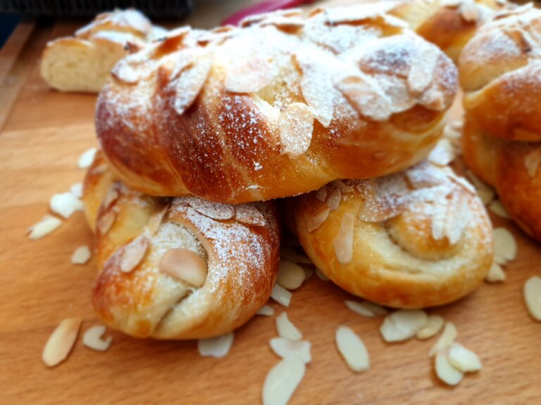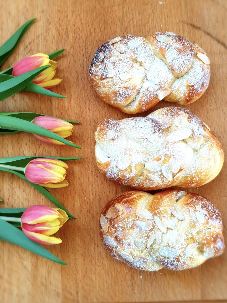 Mische dann das Eigelb mit der Sahne und bestreiche die Zöpfe. Zum Schluss werden die Mandelblättchen noch auf den Zöpfen verteilt.