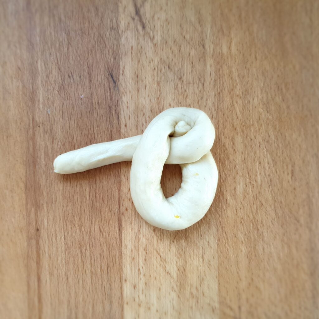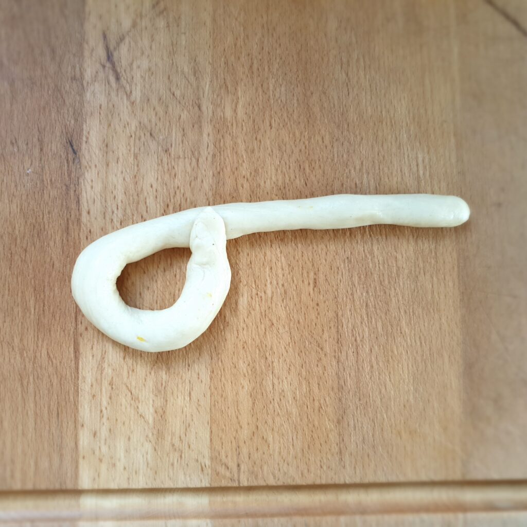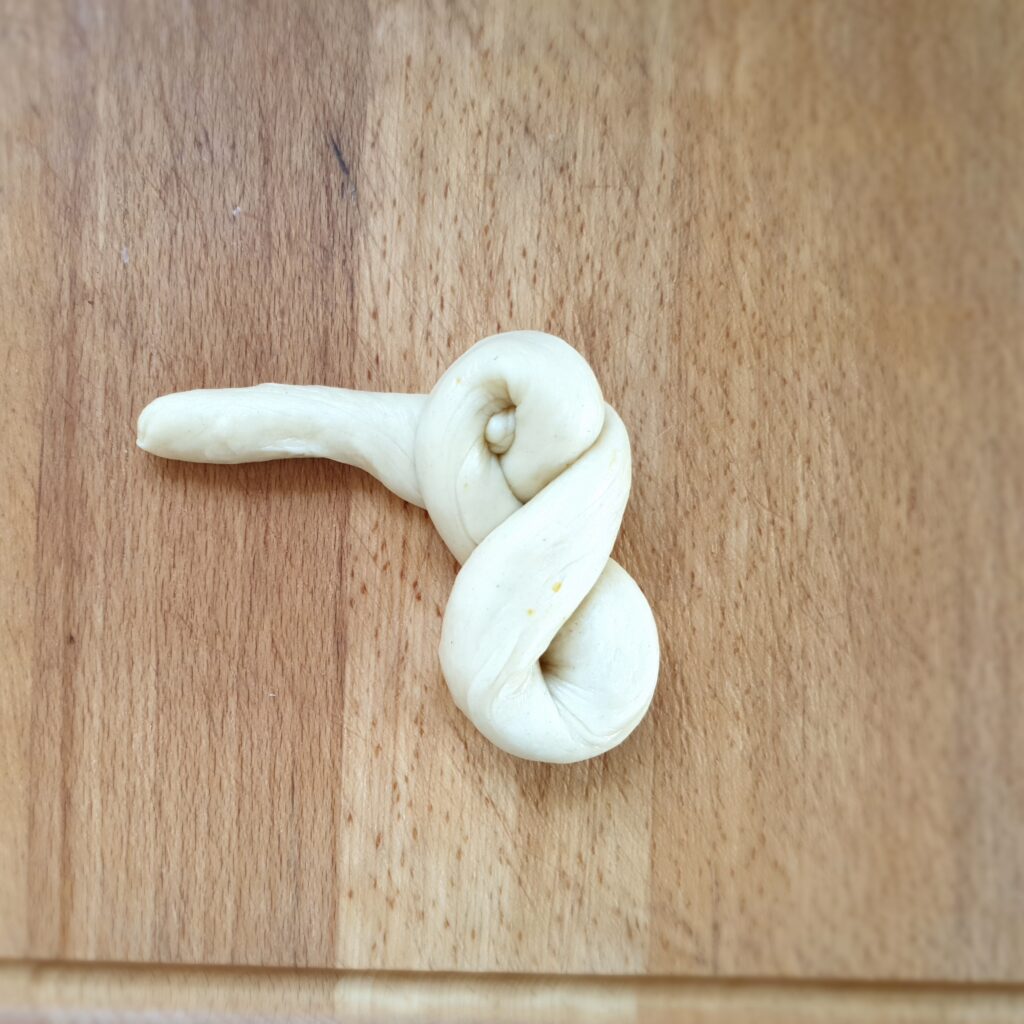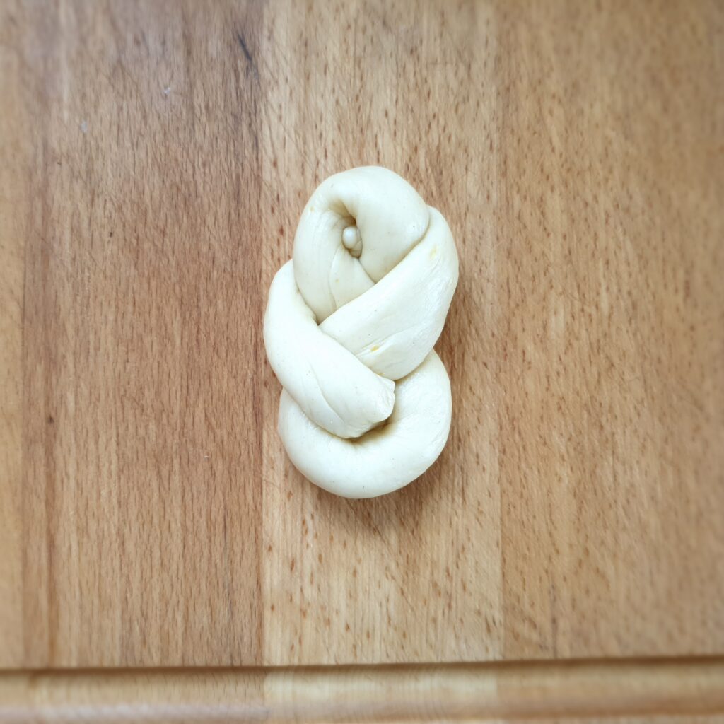 Lege die Zöpfe auf ein Backblech mit Backpapier und lasse sie unter einem Geschirrtuch nochmal 10 Minuten gehen.