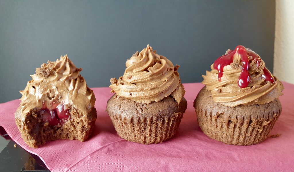 Jetzt könnt ihr die Schokosahne wie oben beschrieben aufschlagen und mit einem Spritzbeutel auf den Cupcakes verteilen. Die restlichen