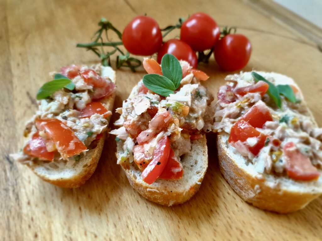 Am besten schmecken die Thunfisch-Tomaten auf frischem Baguette oder Ciabatta. Als Hauptspeise passt das Rezept aber auch super zu